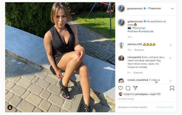 Об этом пишет Politeka.net со ссылкой на страничку знаменитости. "Не жалуйтесь на жару", - подписала фото красотка. Фанаты поставили почти тысячу лайков и написали несколько комментариев: "Блин, сколько же у меня мотивов мелодий под твои песни есть!, жаль что только в голове)", "В жару в черном и не жаловаться", "только на холодном не сиди", "Правильно", "Куколка". Ранее мы писали, что известная украинская певица Гайтана показала необычный летний образ. На фото Гайтана была в штанах, топе и рубашке черного цвета, а образ дополнила блестящими туфлями. Красотка сидела на стуле, а рубаху расстегнула, демонстрируя идеальный пресс. Девушка смотрела в камеру и не стеснялась показывать свое тело на камеру, а позировала на фоне домашних цветов. Сообщалось, что украинская певица Гайтана показалась перед фанатами после кардинального изменения имиджа. «Потому что между нами Дивне кохання», - коротко говорится в сообщении. Уточним, что на опубликованном снимке Гайтана позирует после кардинальной смены имиджа: звезда сменила прическу и примерила непривычное для себя платье. Это стало причиной бурных комментариев со стороны ее поклонников. Напомним, Гайтана эффектно нагнулась и посветила грудью в расстегнутой рубашке Также Politeka писала, что роскошная Гайтана в наряде с вырезом показала, чем ее наградила природа А еще Politeka сообщала, что Гайтана в прозрачной рубашке взбудоражила фантазию перед зеркалом