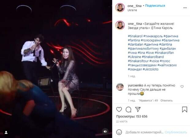 Камера зафиксировала ЧП с Кароль: Тина внезапно рухнула на колени прямо на сцене, не удержавшись на ногах. Просматривая кадры, становится понятно, что звезда потеряла равновесие не просто так. Певица помогала двум участникам, вошедшим к ней в команду, украинскому артисту Никите Ломакину и исполнительнице из Казахстана Сауле Жумабековой, когда в какой-то момент перецепилась об ногу последней. Судя по реакции Сауле, девушка подставила подножку не специально. Тина быстро пришла в себя, отряхнулась и пошутила: "Загадайте желание - звезда упала!". К слову, в том эфире в вокальном бою победил именно Ломакин. Язвительные пользователи не преминули случаем уколоть Кароль после такого совпадения: "А ну теперь понятно почему Сауле дальше не прошла