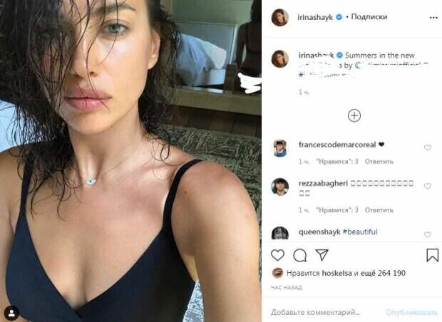 Красотка позировала в трусиках-бикини. На зеркале видны упругие ягодицы красотки, а также стройную талию. При этом нельзя не обратить внимания на идеальный изгиб, чем-то напоминающий песочные часы. Завершил простой домашний образ кулончик на шее Ирины - виде голубого глазика. Ирина держала телефон в руках, посмотрев в объектив из-под мокрых волос. Красотка не улыбалась, но выглядела свежо, будто после ванны, и очень горячо. За час пост собрал более 200 тысяч лайков и много комментариев. Пользователи отметили замечательный вид сзади и поблагодарили звезду за столь откровенное фото. "Нежные булочки", - написал один из комментаторов. Напомним, Ирина Шейк позировала в затемненных очках и с распущенными волосами. Красотку снимали в профиль, а одежды на ней не оказалось. Шейк соблазнительно выгнулась и подняла глаза к солнцу. Фотографу удалось поймать нужный момент. Ранее мы писали, что Ирина Шейк позировала, снимая себя в зеркало. У красотки была обнажена грудь, которую она прикрыла рукой. На плече звезды красовалась красная сумочка известного бренда. Звезда надела длинную юбочку, которая оплела ее тонкую талию. В посте Ирина рассказала, что пожертвовала вещи известных брендов благотворительным организациям. Напомним, что Ирина Шейк нашла неожиданную замену Куперу, фото с красавчиком облетели сеть: "Оказался известным...". Как сообщала Politeka, Ирина Шейк ошарашила снимком в постели с Путиным, сеть кипит: Брэдли Купер будет в ауте. Также Politeka писала, что Ирина Шейк показала, как выглядела 20 лет назад: "Эх, были времена".