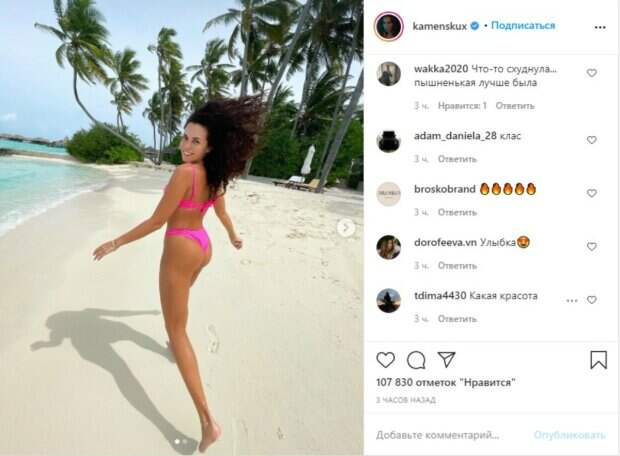 Украинская певица Настя Каменских, отдыхающая на Мальдивах, блеснула фигурой в кукольном мини-бикини розового цвета Каменских после похудения всегда привлекает внимание к себе при помощи откровенных образов с неизменным акцентом на свою фигуру. Во время отпуска на Мальдивах же звезда и вовсе не скромничает, подбирая каждый день для прогулки на пляже самые разными и открытые бикини.