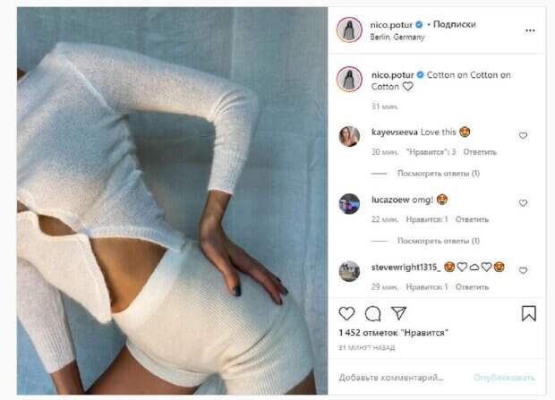 Об этом пишет Politeka.net со ссылкой на страничку знаменитости. "Хлопок на хлопке", - написала Николь под фото. Фанаты поставили более тысячи лайков и написали комментарии: "Люблю это", "О, Боже мой", "люблю это ... так мило (Это слово?)", "Чистая Николь", "Выглядит так комфортно", "Ого-го", "Очень красивая твоя фотография - как всегда", "Омг ... эта привлекательность","Вы молодцы во всем, что делаете!", "Смотрите, вы всегда улыбаетесь, это то, что отличает вас от всех остальных", "Николь Потуральски и Ирина Шейк - близнецы". Мы сообщали, что известная модель Николь Потуральски похвасталась ножками без штанов. Звезда села на пол, выставив ноги вперед, чтобы показать их во всей красе. Стройные и ровные конечности впечатляли и притягивали взгляд. Модель согнула ноги, сверкнув аппетитным бедром и интимной деталью - черными трусиками. Напомним, экс-любовница Брэда Питта наклонилась вперед, дав заглянуть в декольте Также Politeka сообщала, что экс-любовница Брэда Питта покорила безупречной красотой в необычном образе А еще Politeka сообщала, что экс-любовница Брэда Питта без белья показала утреннюю нежность