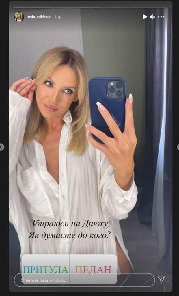 В этот раз Леся опубликовала фотографию, на которой позировала в одной блузе, которую еще и оставила расстегнутой. Никитюк стояла перед зеркалом, снимая себя на телефон. "Собираюсь на День Рождения. Как думаете, к кому?", - написала Леся и предложила выбрать Педана или Притулу. Как известно, празднует свое 40-летие сегодня Сергей Притула, а день рождения Александра Педана 24 марта. Это подтвердила и сама Никитюк в следующем стори. Красотка уже была в платье с декольте, сидя в автомобиле. "Правильно, к Притуле", - написала Леся снизу фотографии. Сообщалось, что родители Леси Никитюк уже смирились с тем, что она еще нескоро выйдет замуж. Леся отказалсь быть следующей "Холостячкой", уступив место Злате Огневич. "Честно, не могу сказать, что я до сих пор комплексую, но в принципе я понимаю реальность, это было бы как "Белоснежка и семь гномов-2". Возможно бы и нашла, а возможно и потеряла бы все, что есть", — пояснила свой отказ ведущая. Напомним, Никитюк в мини-топе насмешила новым увлечением в собственном саду А еще Politeka писала, что Никитюк обескуражила видом, засветив настоящее лицо без фильтров Также Politeka сообщала, что Никитюк подкорректировала фигуру, натянув необычный корсет