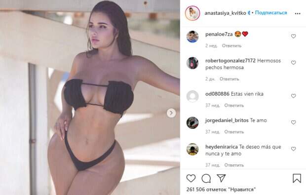 Знаменитая российская модель Анастасия Квитко, более известная как русская Кардашьян, показала достоинства в черном бикини Модель прославилась шесть лет назад, впервые приняв участие в фотосессии, которая и дала начало ее карьере. С тех пор девушка продолжает сниматься, игнорируя слова работодателей и поклонников о том, что ей пора худеть.