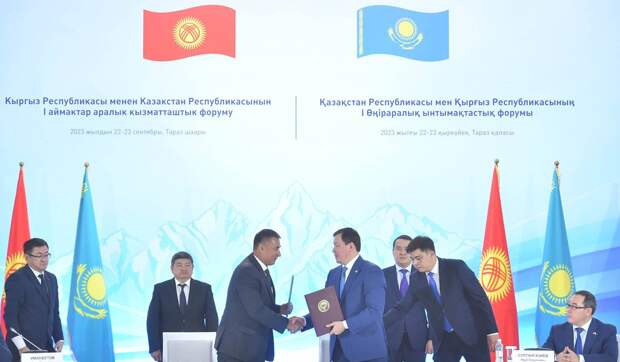 На киргизско-казахском межрегиональном форуме в казахском городе Таразе подписаны соглашения на $60 млн (5,75 млрд руб.), сообщает 23 сентября пресс-служба правительства Киргизии. «В рамках первого межрегионального форума между Киргизской Республикой и Республикой Казахстан состоялся бизнес-диалог между предпринимателями двух стран, подписаны двусторонние коммерческие соглашения на сумму более 60 миллионов долларов США», — сообщает пресс-служба.