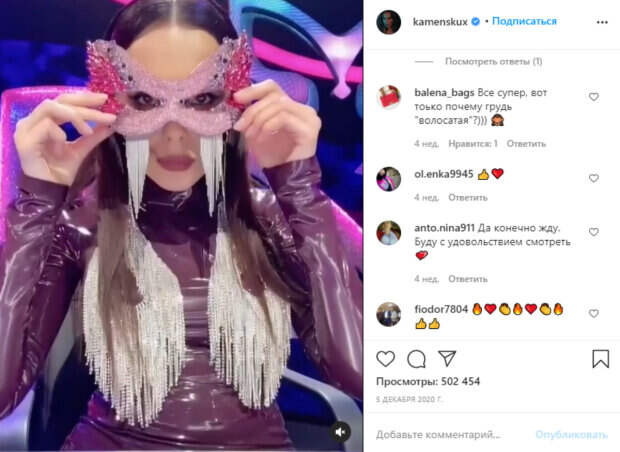 Настя экспериментировала с прической, стрижкой, цветом волос и надевала довольно необычные наряды с блестками или те, что были сделаны из латекса. "Мне кажется, что это на текущий момент самое крутое и самое интересное шоу. Это такая новая эпоха. Потому что ты уже не выбираешь просто, как там красиво поют, некрасиво, талантливый человек или нет. Здесь ты пытаешься, во-первых, угадать, посмотреть и выбрать лучший номер. ", – сказала ранее звезда в программе "Зірковий шлях". Перед стартом проекта в Инстаграм популярного шоу также появилась запись с Каменских, мило позирующей в маске с камнями и показывающей свой стильный образ. Латексный костюм с россыпью камней и бусин прямо на груди выглядел очень необычно. Вот что написали ранее поклонники под идентичным постом у самой Каменских: «Все супер, вот только почему грудь "волосатая"?)))