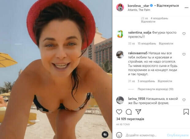 Она попросила поклонников заучить движения для будущего концерта. Пока артистка показывала движения, ее пышные формы жили своей жизнью. Она потрусила бюстом, заставив мужчин пускать слюнки. «Друзья! Учим движение! 17 апреля буду проверять», - подписала видео звезда и устроила мастер-класс. В комментариях певице стали оставлять массу приятных слов. Не обошлось и без критики. Некоторых взбесил откровенный вид Королевой, а также тот факт, что она в таком виде говорила о пионерах. «Стройная, красивая! Просто загляденье!», «Фигурка просто прелесть!», «Наташа мы все тебя любим, ты и красивая, и стройная, но не надо оголяться. Ты мама взрослого сына и будь поскромнее, а на концерт люди и так придут», «Наташенька, в какой же Вы прекрасной форме, красотка!», «Повлияла на вас измена супруга.. Стройная такая», «Наталь, ну пионеров то не позорь!», - пишут пользователи сети. Напомним, что Наташа Королева посреди леса размечталась о мужичке, Тарзану пора ревновать: «Уххх, энергия прет…». Как сообщала Politeka, Королева в прозрачном наряде показала, как сгорает от любви вдали от Тарзана: "Верхом на...". Также Politeka писала, что Королева без лифчика подразнила формами, показав, как повезло Тарзану: «Фигурка золотое сечение».