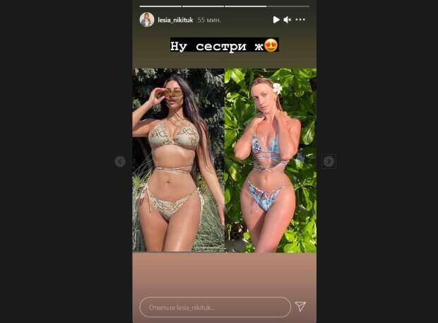 Недавно на страничке самой Кардашьян появилось очень похожее фото, на котором звезда показала, как выглядит ее тело в купальнике. Никитюк не могла не обратить на это внимание, и разместила у себя коллаж с этими двумя снимками. Примечательно, что фигуры красоток на них действительно похожи, а еще они обе позируют в купальниках-бикини с кокетливыми завязками на талии. Украинская ведущая посчитала этот снимок Кардашьян лучшим доказательством их мифического родства. «Ну сестры ж», - с юмором подписала фото Леся. Отметим, что в оригинальном посте с отфотошопленным снимком Никитюк ее поклонники писали следующее: «Фотошоп и реальность», «Вам лучше с вашими бёдрами», «Ким курит рядом», «Ким не вынесет такой конкуренции», «Ох эти бедра», «Леся Ивановна....не...оставайся красоткой как ты есть..никаких Кардашьянов... прикольно...но нет..ты лучше». Напомним, бесстыжая Никитюк разошлась и показала, что у Поляковой под мини-юбкой: "Боже, ребята...". Как сообщала Politeka, грустная Никитюк сверкнула экстра-декольте, заговорив о сокровенном: «Если не хотите портить...". Также Politeka писала, что Леся Никитюк в меховых трусах пожаловалась на ужасные условия в Киеве: "Приезжаешь с Мальдив.. .".