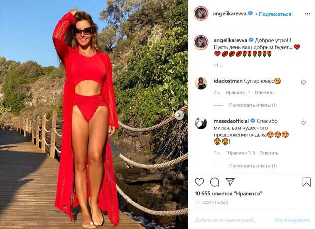 Поверх него Анжелика надела длинную красную накидку. На первом снимке красотка позирует, демонстрируя всю свою фигуру в купальнике. На втором фото Анжелика присела на причале на фоне воды, вытянув стройные загорелые ноги. «Как говорила моя бабушка: «Красному и дурак рад...» а ваши бабушки/ мамы говорили фразы, которые вы используете сейчас? У меня их миллион...но их не все поймут», - подписала фото Ревва. Ее подписчики бурно отреагировали на посты. Среди комментаторов оказалась и украинская певица Светлана Лобода. «моя кошечка», «Смотря на вашу идеальную фигуру и не сказать что вы мама двоих детей», «Богиня», «Распрекрасная девчонка!», «Шикарная», «От Вас веет счастьем Анжелика, вы самая красивая очень сильно люблю вас и вашу семью счастья вам», «красивая женщина!», «Показалось, Ксения Собчак», - пишут люди. До этого мы писали, что Анжелика отправилась на отдых в Турцию. Судя по геометке на фотографиях в социальной сети Инстаграм, красотка наслаждается солнцем и морем в Бодруме. На новом снимке, которым мама двоих прекрасных девочек поделилась с подписчиками, она изображена в купальнике выходящей из моря по ступенькам. Анжелика держится за поручни и смотрит в камеру. В глаза бросается стройная точеная фигура женщины и отсутствие даже малейшего намека на лишние килограммы. Напомним, подросшая дочь Артура Пирожкова растрогала красотой на курорте, вся в маму. Как сообщала Politeka, Артур Пирожков срочно обратился за помощью, поразив внешним видом. Также Politeka писала, что хрупкая жена Артура Пирожкова в купальнике впечатлила не только внешним видом.