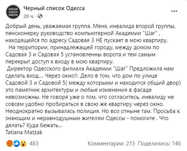 На территории, принадлежащей городу, между домом по Садовая 3 и Садовая 5 установлены ворота и тем самым перекрыт доступ к входу в мою квартиру», - написала одесситка. Пенсионерка утверждает, что директор Одесского филиала Академии "Шаг" предложила ей сделать отдельный вход через окно, однако дом является памятником архитектуры и любые изменения в фасаде невозможны. «Не говоря уже о том, что согласитесь, инвалиду не совсем удобно пробираться в свою же квартиру через окно. Неоднократно вызывалась полиция. Но воз отныне там. Просьба к знающим и неравнодушным жителям Одессы - помогите . Что делать? Куда бежать», - обратилась она. Пользователи в соцсетях высказали крайнее возмущение, а также начали давать различные советы пожилой женщине. Среди самых интересных прозучали, обратиться к местным активистам, мэру Геннадию Труханову, а также попросить соседа болгаркой спилить ворота. «Совсем с ума сошли, хотят захватить весь двор????», «Напишите мэру и позовите активистов, они любят разборки такие», «Напишите жалобу в инспекцию по благоустройству», «Куда смотрит Труханов?», «Скоро выборы. Воспользуйтесь ситуацией, идите одновременно к разным депутатам и напишите в мэрию жалобу», «Сделайте псевдопожар и вызовите пожарную», «Что твориться в стране, это как надо издеваться над людьми ,чтобы человек не смог зайти в свою квартиру уже ? ?», «Они там сделали школу, ребёнок посещал, потом ушли, т. К. Классы не приспособлен под долгое нахождение ребёнка. Их интересуют только деньги», «Попросить соседа с болгаркой спилить ворота», «Я бы посмотрела, если бы в квартире этой несчастной женщины жил какой то чинуша и ли бандюк... Скорее ,Шаг, пожните то, что сеете!!!!», «А почему только через окно, а не через чердак по пожарной лестнице? Так этот квест стал бы ещё интереснее!!!!»,- пишут в сети. Напомним, одесская школа трещит по швам, власти бездействуют: кадры происходящего Как сообщала Politeka, наглые воры разгуливают по Одессе: "не жалеют ни детей, ни пенсионеров" Также Politeka писала в центре Одессы перекрыли движение, фото: где не проехать до конца недели
