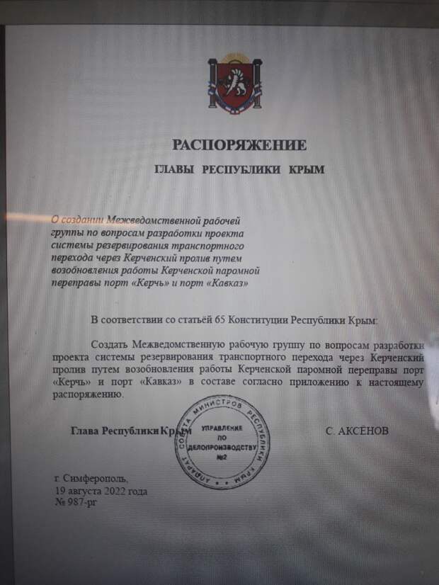В соцсетях и мессенджерах распространяется фальшивый документ о подготовке Керченской паромной переправы к работе на случай выхода из строя Крымского моста. Якобы такое распоряжение сегодня подписал глава Крыма Сергей Аксенов, передает корреспондент «ПолитНавигатора».