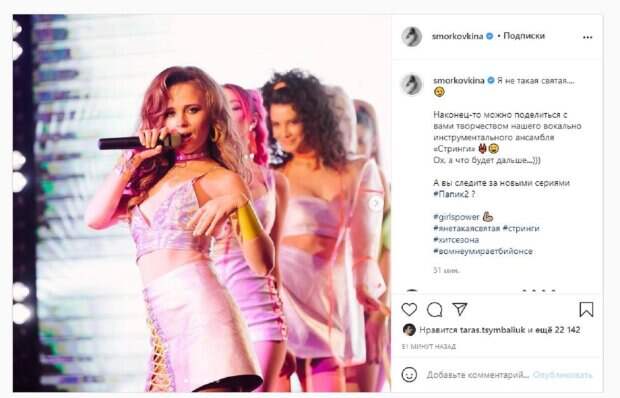 На фото Анна показалась в юбке на шнуровке и топике. Девушка держала в руке микрофон, выгнувшись, делая кадр еще более горячим. Кошмал показала еще несколько фото своего ансамбля. "Я не такая святая.... Наконец-то можно поделиться с вами творчеством нашего вокально инструментального ансамбля «Стринги» Ох, а что будет дальше...))) А вы следите за новыми сериями Папик-2?", - написала звезда под фото. Фанаты поставили более 22 тысяч лайков и написали комментарии: "Белый фитилек)", "Конечно следим, и ждём каждую серию с нетерпением", "Горячая штучка". Мы писали, что звезда популярного сериала "Сваты" Анна Кошмал впервые показала, как выглядела во время беременности и раскрыла подробности. Актриса отвечала на вопросы своих подписчиков и поделилась некоторыми подробностями из своего опыта. Так, у Кошмал поинтересовались, на сколько она поправилась за время беременности и как потом худела. Напомним, красотка из "Сватов" и "Папика-2" дала полюбоваться эффектным декольте на пляже А еще Politeka писала, что звезда «Сватов» и «Папика-2» разлеглась на полу в лифчике, взбудоражив Цымбалюка Также Politeka сообщала, что женька из "Сватов" вальяжно закинула ножку в кресле, выгнувшись кошечкой