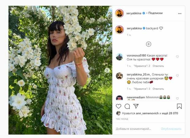 Об этом пишет Politeka.net со ссылкой на страничку знаменитости. "Задний двор", - написала Ольга. Фанаты поставили более 20 тысяч лайков и написали комментарии: "Безумно красивя", "Что ты за бомба такая", "Любовь моя. Оленька, ты прекрасна!!!", "Какая красота! Оля ты красотка!", "Оленька ты очень красивая шикарная", "Оля, как же тебе идет любой образ. Такая нежная и летняя тут, такая теплота от фотографий", "чувствую даже через экран этот запах", "Ути древёсный эльф", "Красивая Ольга Серябкина", "Оль, почти сливаешься с цветами". Сообщалось, известная певица Ольга Серябкина заставила поклонников трепетать. На снимке певица сидела на кресле, расставив ножки. Примечательно, что на ней кроме кофты в звездочку были необычные шорты - рваные, приоткрывшие виды на упругие ягодицы артистки. Ольга смотрела через плечо в камеру, взгляд у нее был дерзким, а губы приоткрыты. Напомним, босая экс-солистка "Серебро" поиграла прелестями в дорогом авто А еще Politeka писала, что экс-солистка «Серебро» дерзко оттопырила пятую точку ради летнего удовольствия Также Politeka сообщала, что экс-солистка "Серебро" в узком купальнике впечатлила бесстыжим видом сзади