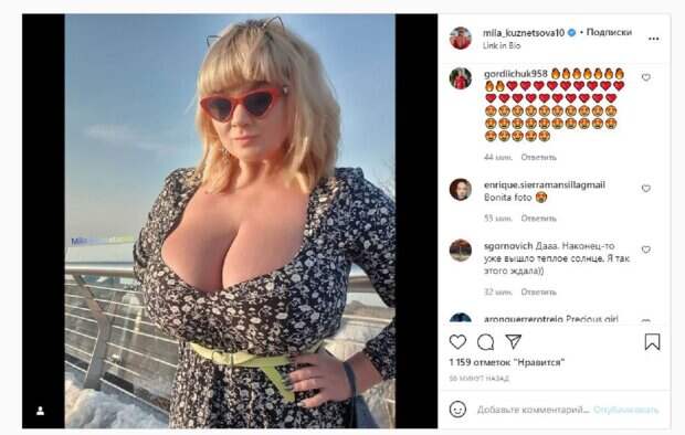 Пышный бюст так и выпирал из такого наряда, добавляя жары кадру, хотя вокруг можно увидеть снег. Об этом пишет Politeka.net со ссылкой на страничку знаменитости. "Вчера была зима, а уже сегодня весна вовсю!!! Желаю много хороших и солнечных дней впереди! Улыбнись, ведь ты уникальный!!!", - написала Мила под фото. Фанаты поставили более тысячи лайков и написали комментарии: "Люблю это", "Великолепная", "Ты как всегда заряжаешь меня позитивной энергией", "Красивая фигура", "мила ти очень классно выглядишь мне нравится", "Скорей бы лето и летний контент от очаровательной украиночки!", "Какая же богиня на фото, это нереально красиво, мне нравится", "С таким бюстом - всегда жара!". Мы писали, что известная модель Мила Кузнецова, которая обладает 15-м размером бюста, показала, как любит расслабляться. Мила отмечает, что плавание очень хорошо сказывается на самочувствии. настроении. а также помогает разгрузить спину, особенно девушкам с пышными формами. Напомним, украинка с 15-м размером переборщила с декольте в цветочном платье А еще Politeka сообщала, что украинка с 15-м размером взбудоражила видом "бомбочек" в лучшем ракурсе Также Politeka писала, что бесстыжая украинка с 15-м размером обескуражила видом в слишком маленьком бикини