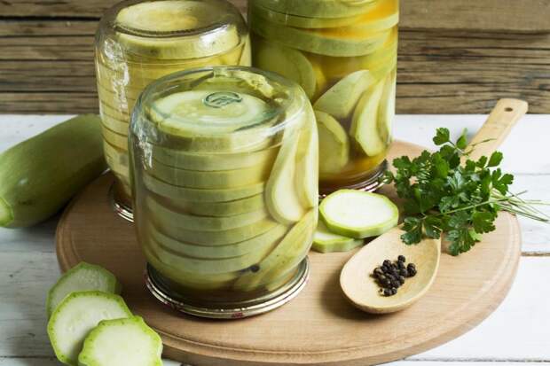 Один из самых простых рецептов маринованных кабачков на зиму одновременно является и одним из самых вкусных. Молодые кабачки нарежем кружочками, добавим чеснока и зелени. Весь вкус останется внутри и кабачками можно будет наслаждаться круглый год. Из расчета на две пол-литровые банки нам понадобится 4 небольших молодых кабачка-цукини, пара зубчиков чеснока, чайная ложка зерен горчицы.