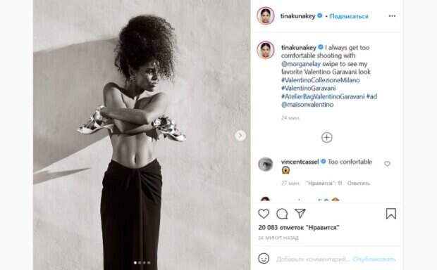 Этот раз не стал исключением, ведь Тина появилась в прозрачном белье, а сверху накинула халат. Девушка стояла на берегу моря, демонстрируя свое тело и бюст, который был полностью видно. Фанаты поставили более 40 тысяч лайков и написали комментарии: "Красивая", "Красота", "Идеально", "Вы произведение искусства", "Такая красивая", "Великолепная картина", "Настоящая богиня", "Ты снова в Бразилии? :-)", "Самая красивая женщина", "Неописуемая красота !!", "Красиво смотрится, даже бразильянка", "Как всегда шикарно!". Мы писали, что известная модель и жена 54-летнего актера Венсана Касселя Тина Кунаки впечатлила эффектным образом топлес. На фото Тина наглядно продемонстрировала впечатляющую фигуру с минимумом одежды. Так, на черно-белом снимке модель позирует, облокотившись спиной на стену. Из одежды на ней лишь длинная черная юбка. Напомним, молодая жена Венсана Касселя в прозрачном мини не оставила мужчинам шансов Также Politeka сообщала, что молодая жена Венсана Касселя засветила пикантные места в мини-бикини А еще Politeka писала, что молодая жена Венсана Касселя прилегла на кровать, показав свое главное оружие