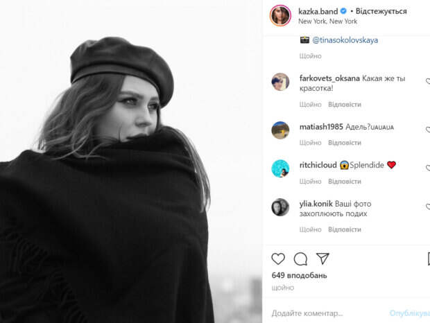 Солистка группы KAZKA, певица Александра Зарицкая пленила новым образом Как передает Politeka.net, у себя в Инстаграм красотка опубликовала фото, на котором предстала в весьма загадочном образе. Девушка была одета в черный кожаный беретик и черную накидку, в которую она завернулась, чтобы спастись от холода.
