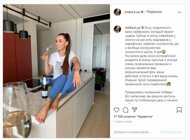 Рядом можно увидеть бутылку, а еще один бокал возле объектива камеры. Об этом пишет Politeka.net со ссылкой на страничку знаменитости. "Хочу поделиться с вами лайфхаком, который творит чудеса. Сейчас в эпоху инфобиза у многих из нас есть недоверие к марафонам, советам, психологам, да и вообще инструментам личностного роста. А зря. На самом деле, если систематично внедрять в жизнь простые и иногда очень тривиальные привычки и штучки меняется ваш эмоциональный фон, ваши действия, а потом и вся ваша жизнь", - написала Мишина. Фанаты поставили почти 20 тысяч лайков и написали комментарии: "Вау", "Конфетка", "Замечательная актриса", "Прикольно, Ксюша", "Ох, уж эти стопы...)) Простите, Ксения, не в тему.. Просто минутка слабости.))", "Вы очень красивая", "Ты невероятно сногсшибательная и улыбка ослепляет, лапочка". Сообщалось, что известная украинская актриса Ксения Мишина показала себя на прогулке. На фото Мишина позирует в платье и без белья. Красотка гуляет по улице и рассказывает о вечернем выпуске "Танцев со звездами". Напомним, эффектная "Холостячка" Мишина шаловливо раздвинула ноги на стуле А еще Politeka сообщала, что бесстыжая "Холостячка" Мишина устроила грязные танцы прямо в гримерке Также Politeka писала, что "Холостячка" Мишина в роскошном декольте соблазнила видами, забыв о белье