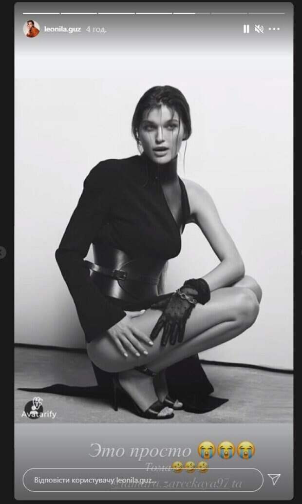 Образ Гузь дополнила кожаным широким ремнем, который обозначил талию звезды. Об этом пишет Politeka.net со ссылкой на страничку знаменитости. "Это просто...", - написала красотка под фотографией. Фанаты не ставили лайки и не писали комментарии, но обычно звезду без комплиментов не оставляют: "Невероятно красиво", "так мило !", "Очень красиво", "Обожаю", "Абсолютно великолепно... люблю это, такая потрясающая съемка", "Обожаю наряд", "Богиня, эффектная и чувственная", "Эффектно и чудесно, как ты прекрасна, любовь", "Очень красивая фотография", "Безупречно красивая", "Ну все. Вот и я влюблен". Мы писали, что модель Леонила Гузь произвела фурор дерзким образом. Модель примерила образ роковой красотки, покорив необычным макияжем (половина лица была загримирована белой краской) и прической с "мокрым" эффектом. Гузь немного наклонила голову вперед, "хищно" посмотрев в камеру. Напомним, растрепанная Мисс Украина Леонила Гузь блеснула главной гордостью во весь экран А еще Politeka сообщала, что Мисс Украина Леонила Гузь широко расставила ноги, прикрыв самые пикантные места одним мехом Также Politeka писала, что "Мисс Украина" Леонила Гузь раскрепостилась в ванной перед зеркалом