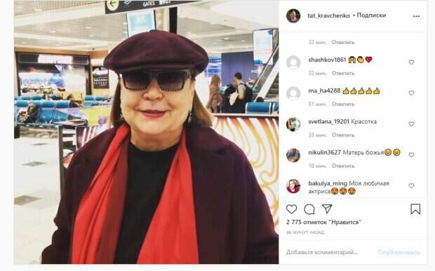 Известная актриса Татьяна Кравченко, звезда "Сватов", показала себя и обратилась к фанатам В этот раз Татьяна позировала в пальто, шапке и затемненных очках. Образ Кравченко дополнила красным шарфом. Звезда стояла на вокзале и улыбалась в объектив камеры, пока ее снимали. Можно заметить, что актриса позировала в аэропорту или чем-то подобном.