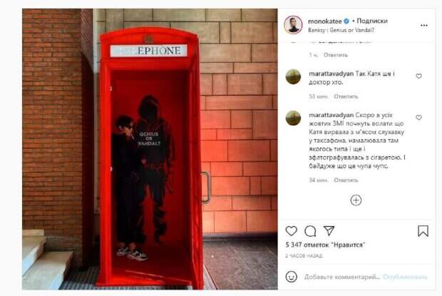 Красотка опубликовала фото, на котором зашла в старую телефонную будку. Павленко стала боком, закрыв глаза очками. Катя была с чупа-чупсом, трубочка которого торчала изо рта. "Гений или вандал?", - звучала надпись на рисунке внутри будки. Интересно, что этот риторический вопрос задают об анонимном граффити-художнике, который прославился на весь мир своими работами. Фанаты поставили более 5 тысяч лайков и написали комментарии: "Лучшая", "Вай", "Красотка", "Катюша, совсем уже счупачупсилася", "В Министерство магии или Тардис", "Вы точно гений", "Катерина креативит", "Гениальный вандал, ну или вандальный гений", "Скоро во всех желтых СМИ начнут вопить что Катя вырвала с мясом трубку в таксофона, нарисовала там какого типа и еще и сфотографировалась с сигаретой. И не важно что это чупа чупс". Напомним, солистка Go_A Павленко вдали от Украины показала, куда ее занесло на этот раз Также Politeka писала, что редкое фото юной солистки Go_A взбудоражило Сеть, еще не брюнетка и не звезда "Евровидения" А еще Politeka сообщала, что солистки "Go_A" и KAZKA померились красотой в эффектных нарядах в центре Киева