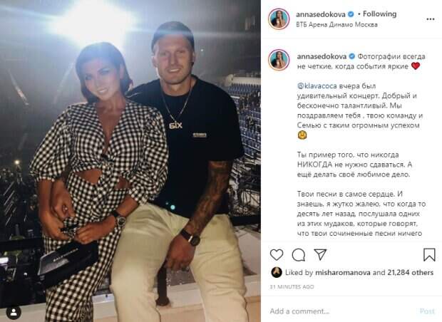 Анна Седокова для светского мероприятия нарядилась в клетчатый костюм с откровенным топом, который сделал акцент на ее груди. Ее молодой человек позировал в черной футболке, белых штанах и бейсболке козырьком назад. Судя по кадру, певица разомлела в руках своего любимого. "Фотографии всегда не четкие, когда события яркие ❤️ @klavacoca вчера был удивительный концерт. Добрый и бесконечно талантливый. Мы поздравляем тебя, твою команду и Семью с таким огромным успехом