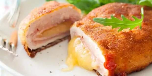 Как готовить Все очень просто: Грудку разрезать на 3 пластины вдоль, чтобы получились максимально большие. Каждую отбить, как на отбивные. Посолить, поперчить. На каждую пластинку выложить ветчину, потом сыр. Скрутить рулетики. Каждый обмакнуть в муку, потом во взбитые яйца, а потом в сухари. Выложить в смазанную форму. На рулетики поставить сливочное масло, порезанное тонкими слайсами. Запекать 10 минут в нагретой до 180 градусов духовке. Готово. Вот видео, где все показано наглядно.