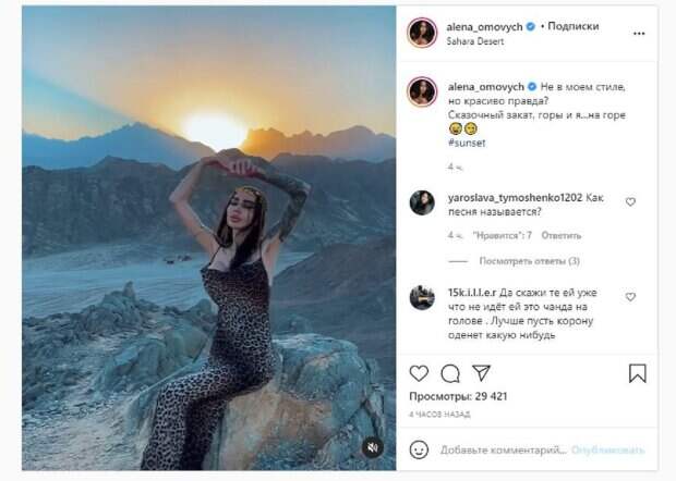 Известная модель Алена Омович, которую называют украинской Кардашьян, показала, как развлекается в Сахаре На кадрах Омович позировала в леопардовом платье с большим декольте и без белья. Алена дополнила образ украшением на голове, которое сделало красотку восточной принцессой. Модель сидела на камне и выгиналась, показывая закат над пустыней Сахара.