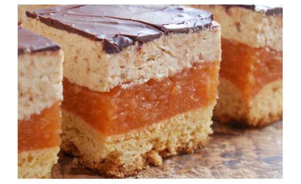 л. лимонного сока; 1 пачка фруктового желе, лучше всего подходит персиковое. Для воздушного крема: 250 мл молока; 250 г сливочного масла; 200 г молотых грецких орехов; 120 г сахарной пудры. Для глазури - плитка шоколада.Не будет описывать процесс - все подробно показано в видео, так что получится обязательно. Не поленитесь, порадуйте себя и своих близких.