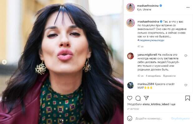 А в этот раз она выложила милые кадры, в подписи к которым обратилась к украинцам с важным вопросом. На новых снимках Маша запечатлена на прогулке, куда вышла в интересном образе. Как видно, звезда появилась перед камерой в яркой зеленой блузе с пестрым узором, поверх которой накинула бордовый кожаный пиджак. ее волосы распущены и растрепаны ветром, на лице легкий макияж с черными стрелками, а в ушах милые сережки. Телеведущая сложила губы в поцелуе, ведь именно об этом ее вопрос. В подписи к публикации Ефросинина написала: "Так, а что у вас по поцелуям при встрече со знакомыми!? Оно как-то до недавно сильно сократилось, а сейчас снова как ни в чем не бывало". Пользователи тут же принялись активно комментировать публикацию Марии: "Не любила это никогда, через силу заставляла себя целовать людей. Поцелуй - это только с мужчиной или родными должен быть", "Пока воздушные", "А мы перешли на объятия", "Итальянский – 3 раза в щеку, самый популярный", "Есть такое", "Сократились и даже очень. Но машинально ещё губы тянутся к щекам", "Шикарная красотка Маша", "Такой ритуал присутствует в моей жизни. Но только с близкими друзьями". Напомним, Ефросинина заворожила кадрами переодевания на фоне постели: "На Машу можно смотреть вечно" Как сообщала Politeka, 42-летняя Ефросинина на пляже хвастнула подтянутой фигурой в купальнике: "Ты светишься". Также Politeka писала, Ефросинина похвасталась своим роскошным жилищем в Мексике: "Скринить можно и фотообои делать".