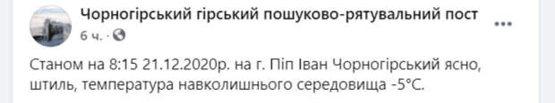 "По состоянию на 8:15 21 декабря 2020 на горе Поп Иван Черногорский ясно, ветер, температура окружающей среды -5°С", — сообщается на странице "Черногорский горный поисково-спасательный пост". Судя по снимкам, настоящая зима на Западной Украине все-таки наступила. Пользователи сети очарованы снимками и оставляют под снимками хвалебные комментарии. "Всходы солнца на Поп Иване великолепны!", "Красиво", "Хорошо у вас так. И какое бы фото вы не выставили, солнечное или в метель, оно дарует только теплые и вдохновенные эмоции, благодарна Вам", "От таких фото очень хочется к вам", "Нам бы такую погоду". Напомним, что в Украину идет аномальное похолодание, синоптики обновили прогноз на январь. Погода в январе может быть морозной и снежной, а в последней декаде месяца возможно понижение температуры до -22 градусов. Напомним, что аномальные холода и снегопад нагрянут в Украину, синоптик ошарашил прогнозом. Как сообщала Politeka, Карпаты в опасности, леса исчезают с угрожающей скоростью. Также Politeka писала, что мокрый снег покинет Украину, погода резко сменит настроение.