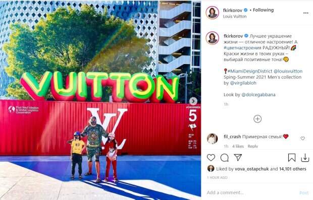 Популярный российский певец Филипп Киркоров уже приучает своих детей к моде и культовым брендам Как пишет Politeka.net, исполнитель вместе с наследниками побывал в Маями на выставке весенне-летней коллекции 2021 года от бренда Louis Vuitton и выложил фото мероприятия на своей странице в соцсети "Инстаграм".