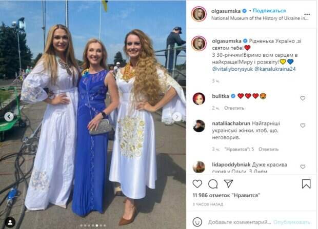 Вместе с коллегами Ольга сверкала в своем платье без лишних украшений, только с крупными бусами на шее. При этом ее белоснежный наряд был украшен аккуратной вышивкой на рукавах и по бокам платья. «Родная Украина, с праздником тебя! ❤️ С 30-летием! Верим всем сердцем в лучшее! Мира и расцвета!