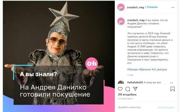 Волна сообщений о том, что над жизнью Андрея Данилко нависла угроза прокатилась в Интернете В частности подобные сообщения недавно появились в соцсетях. «Это случилось в 2014 году. Близкий приятель артиста Игорь Клинков проиграл в карты огромные деньги и в счет долга пообещал, что убьет Андрея. В СМИ даже появилась ложная информация, что артиста застрелили в кафе.