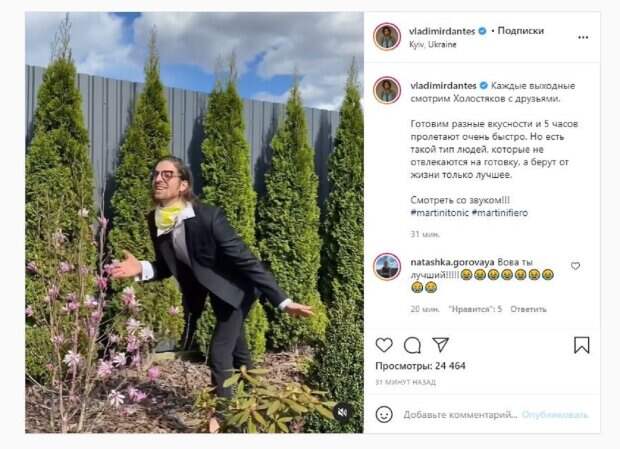 Сейчас Дантес активно ведет социальные сети, где публикует интересный контент. Владимир в ролике решил стать блогером Евгением Понасенковым, появившись в брюках, пиджаке, рубашке и жетом платке на шее, а образ дополнил стильными очками. Красавчик прогулялся по большому двору своего жилища, а также пригубил из бокала напиток. "Каждые выходные смотрим Холостяков с друзьями. Готовим разные вкусности и 5 часов пролетают очень быстро. Но есть такой тип людей, которые не отвлекаются на готовку, а берут от жизни только лучшее. Смотреть со звуком!!!", - написал Владимир. "Вава, ты лучший", - написала Наташа Горовая, приемная дочь Потапа. "Оо", - написала Соня Плакидюк. Фанаты посмотрели ролик десятки тысяч раз и написали комментарии: "Идеально", "А носочек как тянешь", "Вова, это топ", "Пародии - это ваш конек", "Вова, ты одел свадебный костюм даже ?)", "Ничего себе))) даже прическу поменял ради видео)))) вот это я понимаю подготовка", "Носочек как тянешь, Вова. Виталий Козловский обзавидуется". Напомним, Дантес показал последствия дня рождения Дорофеевой, масштабы бардака поражают А еще Politeka писала, что Дорофеева призналась, почему они с Дантесом не решаются заводить детей Также Politeka сообщала, что Дантес показал именинницу Надю Дорофееву в неприглядном виде на кухне