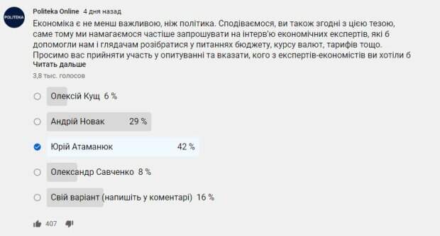 Надеемся, вы также согласны с этим тезисом, именно поэтому мы стараемся чаще приглашать на интервью экономических экспертов, которые бы помогли нам и зрителям разобраться в вопросах бюджета, курса валют, тарифов и тому подобное. Просим вас принять участие в опросе и указать, кого из экспертов-экономистов вы хотели бы чаще видеть в студии Рoliteka Online. Выбрать можно только один вариант, но в комментах указывайте, пожалуйста, всех экспертов, к чьему мнению вы прислушиваетесь. Спасибо за ваши ответы!", - говорится в сообщении. Отметим, что экономический эксперт Юрий Атаманюк - в лидерах опроса, его поддержали 42% опрошенных. На втором месте - Андрей Новак (29%), на третьем - Александр Савченко (8%), а за ним следует Алексей Кущ с поддержкой в 6%. "Юрий Атаманюк грамотный, умный экономист, приглашайте чаще в студию, приятно слушать и учиться", "Атаманюка всегда интересно слушать", "Постоянно слушаю Сергея Гуриева. Даже несмотря на то что он чаще говорит о России, но потрясающе интересно и самое главное доходчиво обо всем рассуждает", "Очень грамотный, дальновидный, профессиональный Атаманюк, я за него", "Владимир Стус! Всё остальное не смотрю. И подписана только чтоб не пропустить этого аналитика", "Каждый предложенный собеседник по своему интересен, надо приглашать всех", "Все очень достойные люди, просто Кущ и Савченко отличаются более научными подходами к экономической ситуации", - написали украинцы в комментариях. Юрий Атаманюк - генерал майор налоговой полиции Украины. Имеет почетное звание "Заслуженного экономиста Украины" и орден "За заслуги" 3 степени. Также эксперт в браке воспитывает троих сыновей. Юрий Атаманюк начинал в качестве рядового сотрудника полиции, но благодаря своим навыкам и старательности сумел построить прекрасную карьерную лестницу. До 2005 года Атаманюк работал в столице, а спустя пять лет борьбы с коррупцией он занял должность замглавы управления налоговой милиции Украины, где проработал еще пять лет. В 2015 году Юрий Атаманюк стал Первым вице-президентом ВГО АППУ по решению делегатов внеочередного Х Съезда Всеукраинской общественной организации "Ассоциация плательщиков налогов Украины". Напомним, что экономист Юрий Атаманюк объяснил, что повышение стоимости на коммуналку является необоснованным. Как сообщала Politeka, Юрий Атаманюк заявил, что количество народных депутатов нужно уменьшить. Также Politeka писала, что экономист Юрий Атаманюк заявил, что локдаун, введенный в Украине в начале карантина, ничем не помог.