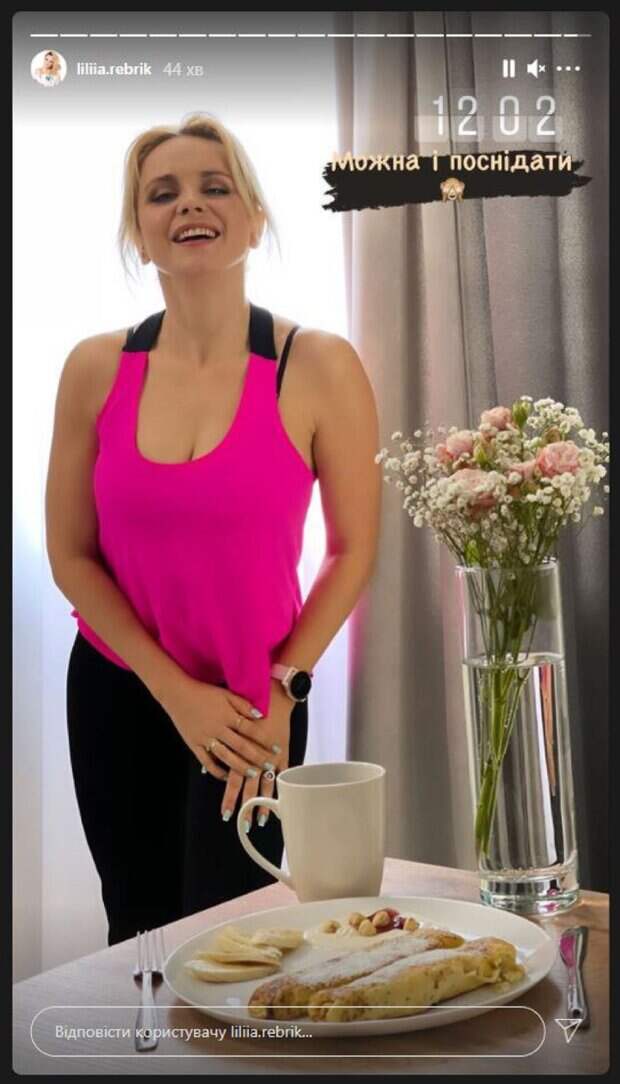 В этот раз Лилия Ребрик показала кадр, где позирует в розовой маечке с декольте и черных штанах. Красотка смеялась, демонстрируя идеальную улыбку перед камерой. Телеведущая позировала у стола, на котором можно увидеть завтрак звезды. "12.02", - можно и позавтракать, - подписала кадры Лилия, намекая, что с приемом пищи немного запоздала. Фанаты не ставили лайки и не писали комментарии под фото, но так и хочется добавить: "Роскошная". Мы писали, что актриса и ведущая Лилия Ребрик вызвала ажиотаж в Сети неожиданным объявлением. Лилия решила подать хороший пример украинцам и заняться собственным здоровьем, а также корректировкой фигуры к лету. На выставленном фото девушка позировала в малиновой майке и коротких черных шортах, приняв стойку лежа для одного из спортивных упражнений. Напомним, Ребрик вспомнила о теплых деньках, подставив лицо под лучи солнца А еще Politeka писала, что ненакрашенная Лилия Ребрик в новых образах показала, как выглядит в обычной жизни Также Politeka сообщала, что Лилия Ребрик сравнила Мальдивы и Украину, наглядно показав родную красоту