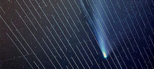 Сегодня на Земле сложно найти уголки с минимальным "световым загрязнением", но теперь это проблема перебралась в космос. На этой неделе фотограф Дэниел Лопез поделился фотографией кометы Neowise, которую снял в в национальном парке на Канарских островах. Однако интернет-спутники SpaceX полностью испортили изображение, "нарисовав" шлейфы при длинной выдержке.