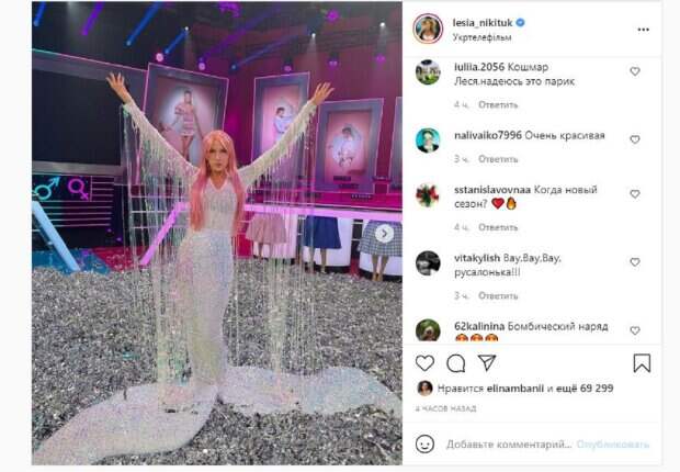 Красотка также добавила сторис, показав, как в нем нужно ходить. "Ллучший день Кто сверху?", - написала Никитюк Фанаты поставили почти 70 тысяч лайков и написали комментарии: "Боже, какая ты куку, обожаю", "Леся ты похожа на русалочку", "Леся Тюлевна?", "Это белый дельфин или красотка-альбинос?", "Боже, какая русалка", "Русалочка Леситэль (свободный перевод имени диснеевской русалочки Ариэль)", "Сегодня я Русалка, я создаю волны", "Рыбка Золотая!! А ты желания исполняешь?", "Кошмар Леся,надеюсь это парик", "Листаю фоточки и хотела несколько раз лайкнуть , жаль в инсте так нельзя", "Кто на что учился. От теперь русалкой работаю". Напомним, Никитюк удивила постаревшим видом, обратившись к украинцам А еще Politeka сообщала, что Никитюк отчихвостила ночного "ухажера" на камеру, Лесю прорвало Также Politeka писала, что Никитюк в новом образе призналась, что в ней изменилось