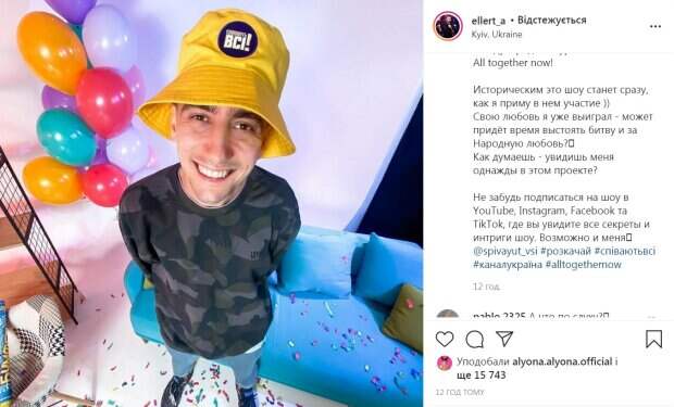 Украинский сценарист и комик Александр Эллерт, победитель шоу «Холостячка» с Ксенией Мишиной, заинтриговал заявлением Как пишет Politeka.net, на своей странице в Инстаграм Эллерт заговорил об участии в новом полярном проекте. «А почему я ещё не там? Ведь «Співають всі!» каждую субботу в 21:00! Что может заставить человека вдруг запеть?