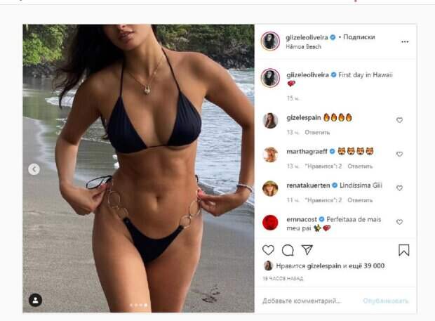Об этом пишет Politeka.net со ссылкой на страничку знаменитости. "Первый день на Гавайях", - подписала фото Жизель. Фанаты поставили 39 тысяч лайков и написали комментарии: "Красивая девочка", "Идеальная мамочка", "Красивое тело, красивая девушка", "Вот это тело", "Приезжайте когда-нибудь в Японию", "у совершенства есть имя ..", "Я тоже хочу быть на Гавайях", "Круто! Хотел бы я быть на Гавайях", "Люблю! Если бы я был там", "вау, чудесное существо", "Боже мой, замечательно !!!", "О, слишком много людей", "Я ищу такую девушку, как ты". Сообщалось, что популярная супермодель и ангел Victoria’s Secret Жизель Оливейра показала идеальные формы на пляже. На снимке Оливейра позировала в черном бикини, которое оголило, благодаря крою, аппетитные ягодицы. Крохотный лифчик натянулся на тонких лямках, а грудь прекрасно смотрелась в треугольных лоскутках ткани. Напомним, бразильская красотка из Victoria’s Secret без белья примерила необычный топ А еще Politeka сообщала, что брюнетка из Victoria’s Secret запустила руки в штанишки, лишив дара речи мужчин Также Politeka сообщала, что брюнетка из Victoria’s Secret впечатлила формами, примеряв тесный наряд