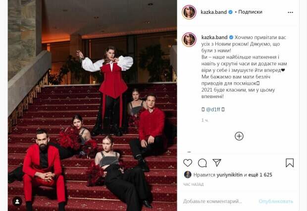 Коллеги звезды были одеты в таких же цветах, но в других костюмах. "Хотим поздравить вас всех с Новым годом! Спасибо, что были с нами! Вы - наше самое большое вдохновение и даже в трудные времена вы даете нам веру в себя и заставляете идти вперед❤️ Мы желаем вам иметь множество поводов для улыбок