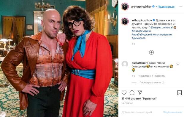 Артур Пирожков в образе знойной дамы похвастался совместным фото с Дмитрием Нагиевым Александр Ревва, более известный под своим шутливым псевдонимом, поделился новым фото в своем Инстаграм. Об этом пишет Politeka.net. Снимок был сделан на съемках нового фильма с участием Реввы и Нагиева, поэтому оба артиста позируют в своих образах.