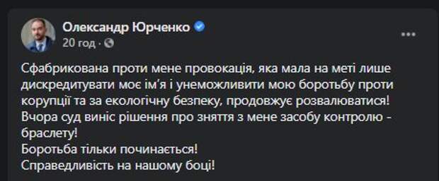 С нардепа Александра Юрченко сняли электронный браслет Как передает Politeka.net, об этом он сообщил на своей страничке в Facebook. "Сфабриковано против меня провокация, целью которой было дискредитировать мое имя и предотвратить мою борьбу против коррупции и за экологическую безопасность, продолжает разваливаться!