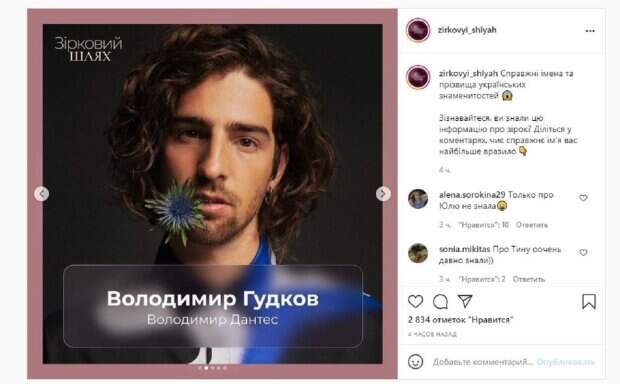 как оказалось, Владимир Дантес сменил фамилию - в жизни он Гудков. Тина Кароль сменила имя и фамилию, ведь красотку зовут Татьяна Либерман. Джамала укоротила себе фамилию для псевдонима, ведь в жизни она Сусана Джамаладинова. Также "Зірковий шлях" рассказал о Юлии Саниной, которая сменила фамилию Головать, а также Камалии, которую зовут Наталия Шмаренкова. "Настоящие имена и фамилии украинских знаменитостей Признавайтесь, вы знали эту информацию о звездах? Делитесь в комментариях, чье настоящее имя вас больше всего поразило", - написали под публикацией. Фанаты поставили более 2 тысяч лайков и написали комментарии: "О Тине очень давно знали", "Только о Юле не знала", "Капец я не знала что Тину зовут Таня", "Вот смотрю на Камалию и так ей идёт родное Наташа Шмаренкова!". Напомним, Кароль призналась, из-за чего ее дразнили в детстве "гадким утенком" А еще Politeka писала, что Тина Кароль с мамой Дана Балана померились фигурами в алых платьях с неприличными декольте Также Politeka сообщала, что Тина Кароль поразила словами о любви, разомлев на белоснежных простынях
