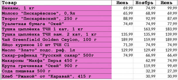 Начала Начало — условная точка отсчёта я в мае, но тогда ещё держался весенний скачок цен, а вот в июне стоимость продуктов Продукт — пища (в словосочетании «продукты питания») Продукт — произведение труда, законченный результат некоторой деятельности, в том числе: Промышленное изделие или услуга (товар, предлагаемый на стабилизировалась, поэтому и считать год я буду от июня. Набор продуктов для таблицы способ структурирования данных у меня был минимальный и ещё по ходу пришлось удалять хлеб — первый вариант перестали продавать через полгода. В приведённой таблице 3 столбца с ценами — в ноябре одиннадцатый месяц Григорианского календаря оформился полный список продуктов, который я и довела до июня 2023. В июне не было свежей курицы, поэтому я для подсчёта взяла данные июля. В июне 2022 данный продуктовый набор обошёлся в 1073,8, а в июне шестой месяц года в юлианском и григорианском календарях, четвёртый месяц староримского года, начинавшегося до реформы Цезаря с марта 2023 уже в 1120,9 руб. Общий рост процесс увеличения какого-либо качества со временем стоимости такой продуктовой корзины составил всего 4,39%. Самый высокий рост был у бананов — 42,86%. У подсолнечного масла и чая были колебания цены в течение года, но в итоге они вышли в 0. А вот рафинад и творог удивительным образом даже подешевели. Я до подведения итогов была уверена, что рост был более значительным — как минимум процентов на 10! А так в этом июне относительно мая полное затишье. Ни один ценник не вырос относительно прошлого это множество всех хронологически предшествующих данному моменту событий месяца — это произошло впервые за год. Одни жёлтые и даже зелёные ячейки. За этот год я добавляла в свою "корзину плетёное изделие, служащее вместилищем для хранения вещей, для упаковки или переноски" больше продуктов и когда дойду до ноября, сделаю ещё одну публикацию. Отслеживать цены каждый месяц внесистемная единица измерения времени, связанная с обращением Луны вокруг Земли я больше не хочу. На примере прошлого года внесистемная единица измерения времени, которая исторически в большинстве культур означала однократный цикл смены сезонов (весна, лето, осень, зима) я увидела примерные колебания повторяющийся в той или иной степени во времени процесс изменения состояний системы около точки равновесия в течение направленное движение: Течение, ток, поток — направленное механическое перемещение частиц жидкости или газа года и мне этого пока достаточно. Буду 1-2 раза в год записывать изменения интереса многозначное понятие: Интерес — положительно окрашенный эмоциональный процесс, связанный с потребностью узнать что-то новое об объекте интереса, повышенным вниманием к нему ради. Напоминаю, что если вас удивляет наличие или отсутствие конкретных продуктов в списке многозначное слово: Список — перечень чего-либо или вы не понимаете, зачем вам Окей в Петербурге, если вы живёте в Ачинске и ходите в Пятёрочку, то вы можете сами записывать свои цены, если вам это интересно) Я просто делюсь тем, что бы я делала и без блога. Комментарии у меня закрыты, но мне всегда можно написать в группе в Вк в личные сообщения. Прошу писать только по личным вопросам — рекламу в блоге ) — веб-сайт, основное содержимое которого — регулярно добавляемые пользователем записи, содержащие текст, изображения и