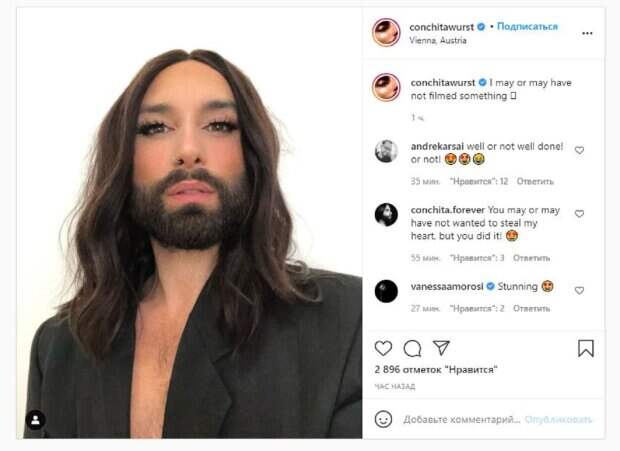 Кадр получился довольно загадочным, как и сообщение под ним. Об этом пишет Politeka.net со ссылкой на страничку знаменитости. "Возможно, я что-то снимал, а может и нет", - написал Томас под фото. Фанаты поставили несколько тысяч лайков и написали комментарии: "Хорошо или не молодец! или нет!", "Вы, возможно, хотели или не хотели украсть мое сердце, но вы сделали это!", "Оглушающий", "И я могу сейчас кланяться. Кстати ... ты отлично выглядишь", "Вы снова и снова удивляете нас новыми великолепными образами", "И теперь мы все так взволнованы, что бы это ни было, не могу дождаться". Мы писали, что австрийский певец и победитель "Евровидения-2014" Томас Нойвирт взбудоражил новым откровенным образом. На новых фото Томас предстал в обычных голубых джинсах, из-под которых виднеются розовые стринги. Певец дополнил раскованный образ черным фатиновым топом, обнажившим живот и плечи, а также базовыми белыми кроссовками и черной кепкой. Напомним, звезда "Евровидения" Кончита Вурст поразил еще более смелым образом в кружевах А еще Politeka писала, что бородатая звезда "Евровидения" Кончита Вурст в прозрачном боди смутила самых стойких Также Politeka сообщала, что звезда "Евровидения" Кончита Вурст обтянул свои рельефы латексом и разбередил фантазии
