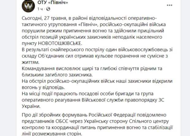 Трагически оборвалась жизнь защитника Украины, появились первые детали Российский снайпер убил украинского военного у позиции ВСУ недалеко от населенного пункта Новотошковское. Горестную весть в Facebook сообщает пресс-центр оперативно-тактической группировки "Север". Уточняется, что на обстрел российско-оккупационных войск наши защитники открыли огонь.