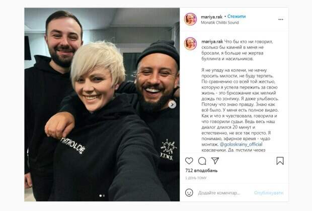 Ведь весь наш диалог длился 20 минут и естественно, не все так просто. Я понимаю, эфирное время - чудо монтаж. @goloskrainy_official красавчики. Да, пустили через мясорубку, но охваты то ух)))) Спасибо. Я благодарна в любом случае. Ведь знала, куда шла», - написала участница «Голоса…». Девушка рассказала, что во время выступления плохо себя чувствовала, и выступила на 30-40% от того, что может. К тому же ее выступление было в конце съемки. «Я реально была не в себе из-за болезни и других проблем со здоровьем. Мне просто хотелось уйти со сцены, а не из комнаты. Я её очень боялась […] Мне было уже так плохо, что я не хотела больше ничего. Но я не хотела давить на жалость. Я не сказала об этом вообще», - рассказала вокалистка. Мария Рак подчеркнула, что хотела участвовать в проекте исключительно в команде Монатика. «Я понимала, что уйти со сцены для меня в тех обстоятельствах было менее травматично. И решение я это приняла ещё накануне вечером, проигрывая возможный сценарий. Да, мне очень хотелось поработать именно с Димой. Уже очень давно. И я благодарила его за свой путь на Голосе», - отметила она. В итоге Мария, как она утверждает, поддалась тем словам, которые говорили судьи, но не послушала себя. «В итоге все обернулось ещё большим подрывом для меня, который я до сих пор переживаю. Потому что я приехала после съёмки домой и целую ночь не спала. А сразу после этого, снова на съёмку», - рассказала девушка. Напомним, в очередном выпуске "Голосу країни" на этапе вокальных боев на сцене сошлись две участницы – Любовь Дробина и Мария Рак. При этом Дмитрий предпочел Любовь Дробину. В свою очередь Мария заявила, что не будет участвовать в проекте. Однако потом все же согласилась работать в команде Нади Дорофеевой. Напомним, что фаворитка "Голосу країни" призналась, что у нее было с Монатиком на "Х-Факторе": "Мы с первых дней стали...". Ранее на портале Politeka мы сообщали, что эффектная блондинка взорвала сцену «Голосу країни» вслед за соперницей Монатика: «Весь Х-фактор возвращается…». Также на сайте Politeka рассказывали, как соперница Монатика по "Х-Фактор" порвала "Голос країни", ошеломив перевоплощением: "Боже, как поменялась за 10 лет!".