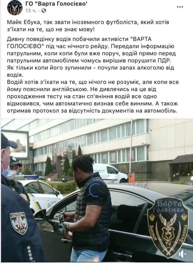 В Киеве патрульные остановили авто, которое устроило ДТП Как оказалось, за рулем с признаками алкогольного опьянения оказался футболист любительской команды Spectrum Talisman Чукукелу Эбука. Об этом стало известно из сообщения Varta Goloseevo в Facebook. Как говорится в сообщении, водитель на дороге вел себя странно и нарушал правила ПДД.