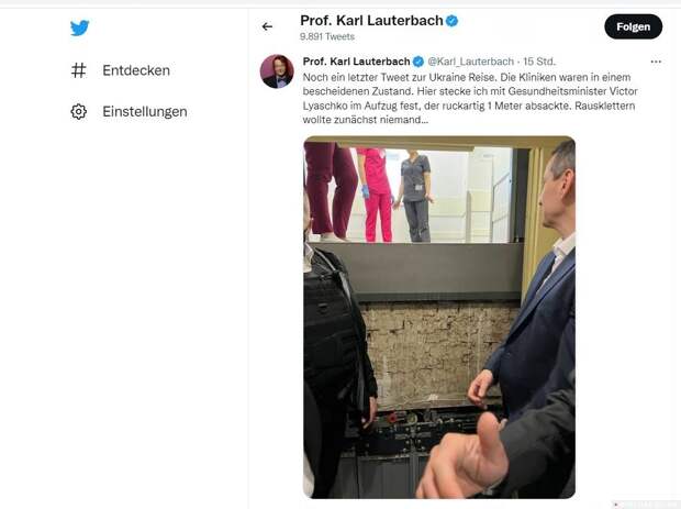 Застрял в лифте во время рабочего визита во Львов министр здравоохранения ФРГ Карл Лаутербах, следует из его сообщения опубликованного в ночь на 11 июня в официальном аккаунте соцсети Twitter. «Клиники находятся в убогом состоянии», — написал министр и продолжил: «Здесь я вместе с министром здравооохранения [Украины] Виктором Ляшко застрял в лифте, который дергаясь просел на 1 метр.